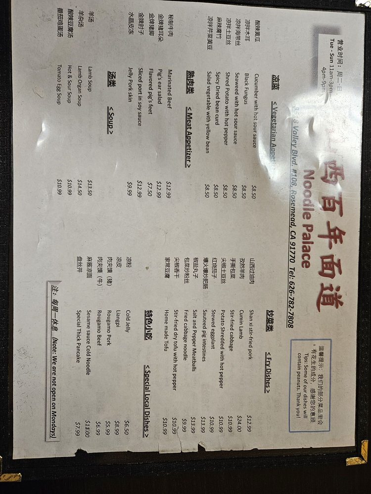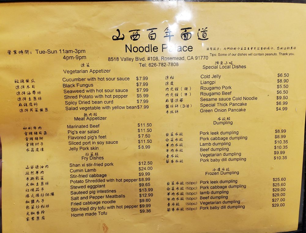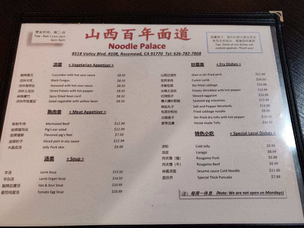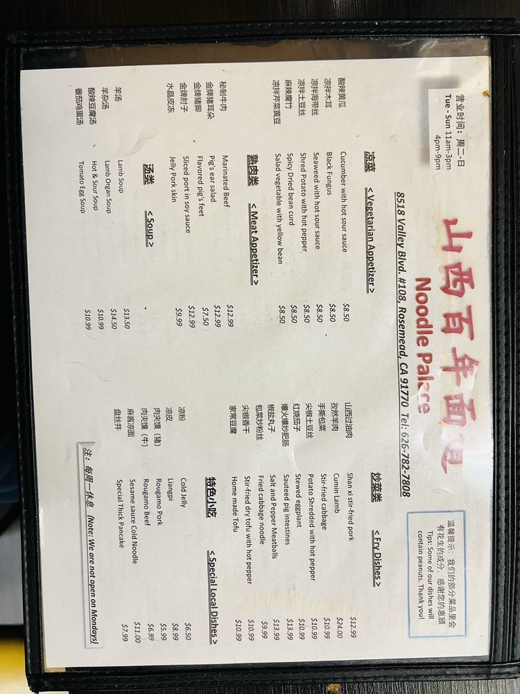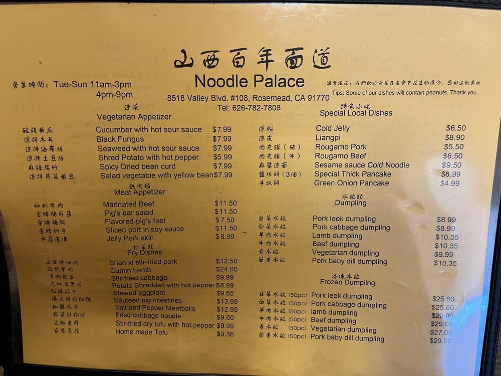 Introducing the Menu at Noodle Palace: Located at 8518 Valley Blvd, Rosemead, CA, Noodle Palace offers a delightful escape for noodle enthusiasts. Renowned for its authentic Shanxi-style handmade noodles, this casual eatery is perfect for groups or a quick takeout. The menu features a variety of flavorful dishes, including the Knife Cut Noodles with Beef and the must-try Rougamo Pork. Guests are raving about the fast service and generous portions, making it an affordable dining option.